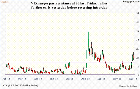 More often than not, when the spot is overbought, spikes and then reverses, that would be a time to sell volatility. We could be on the verge of one. The caveat of course being the FOMC meeting/message tomorrow. Barring a drastically hawkish message, odds favor VIX comes under downward pressure near-term.