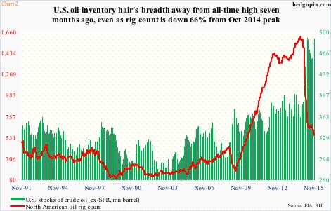 So consider this. WTI price is down 62 percent since last June, rig counts are down 66 percent from last October, yet crude stocks are near all-time highs and production is not that far away from all-time highs.