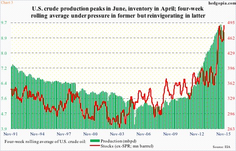 In fact, this was the 10th straight weekly increase in stocks, which earlier dipped to 450.8 million barrels in the August 21st week. The gradual increase has resulted in the four-week rolling average coming back to life again (Chart 3). The chart also plots production of crude oil, which has declined in recent weeks, but from a very elevated level.