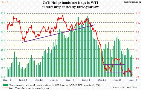 In the futures market, non-commercials are not positioned for this scenario. They are still net long WTI futures, but have been cutting back since May this year (Chart 4). As of Tuesday last week, they held 218,745 contracts – the lowest since December 2012.