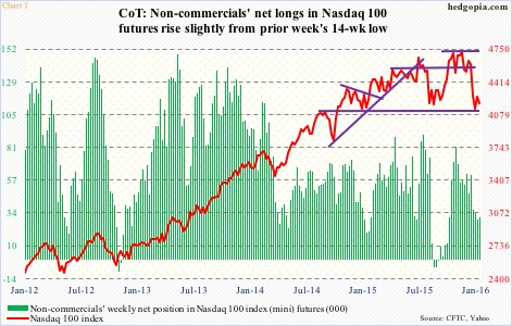 This probably explains why, despite the shellacking the Nasdaq 100 suffered the past three months, non-commercials are yet to aggressively warm up to Nasdaq 100 futures. As of Tuesday last week, they held 30,291 contracts, only up marginally from the prior week’s 29,078, which was a 14-week low (Chart 1). Between the periods, the Nasdaq 100 rallied 2.1 percent, but that was not enough to tempt these traders into adding to net longs.