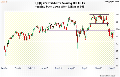 Maybe they were waiting to see if QQQ ($102.15) would be able to take out resistance at $105. This has been an important price point going back to November 2014. On Monday, the ETF just about kissed that resistance, and was repelled (Chart 2). Come Tuesday, it dropped 2.2 percent, and is sitting a touch under its 10-day moving average.