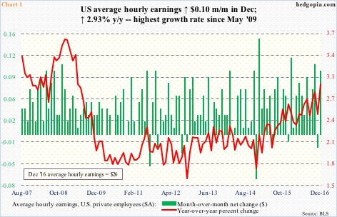 The last time average hourly earnings of U.S. private-sector employees grew with a three handle was April 2009 … means in the current recovery wages are yet to print growth of three percent.  December came close, with a year-over-year increase of 2.93% to $26 (Chart 1).chart-1