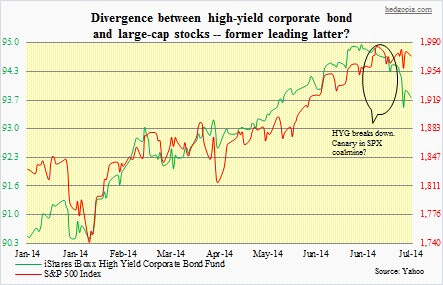 HYG, SPXWhile on the topic of divergence, here is one more.  Typically, high-yield corporate bonds behave more like stocks than bonds.  Ironically, yields on such bonds are not living up to their name.  They were yielding just below five percent in June!  In a yield-starved environment and amidst investor belief that the Fed provides a backstop for the entire market, investors have not shown any hesitancy in moving up the risk curve.  But something has changed lately.  Both HYG (iShares iBoxx High Yield Corporate Bond Fund) and JNK (SPDR Barclays High Yield Bond ETF) peaked late June and quickly shed 1.5-1.6 percent before trying to stabilize.  In bond land, that is a sizable drop, and was quick – kind of reminds me of the small-cap two-and-a-half-month meltdown beginning early March.  The adjacent chart shows the breakdown in the relationship between HYG and the S&P 500 Index.  It is too soon to say if it is even a breakdown, and if it is, the time it will take for the latter to catch up with the former.  We know this much.  Long-term, HYG is grossly overbought.  Medium-term, the process of unwinding overbought conditions has already begun, and probably has a ways to go.