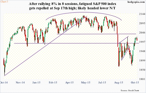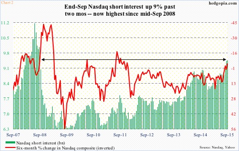 Stocks have rallied strongly since late September. Through intra-day high yesterday, the SPX rallied eight percent in 10 sessions. The short interest data in Charts 1 and 2 are as of end-September, so it is possible the latest rally probably caused some shorts to cover.