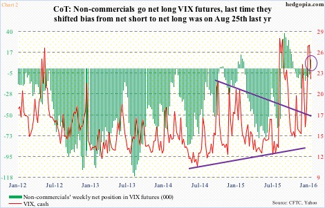 Several times in the past, non-commercials going net long VIX futures has coincided with a peak in the spot, which by default means a trough in stocks. Chart 2 shows three such occasions: October 2014, January 2015, and August 2015.