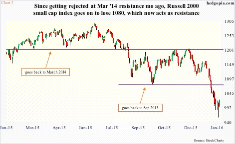 Speaking of the 1080 resistance on the Russell 2000, Chart 3 depicts the breakdown it has suffered. Except for a few months last year, the index has essentially been going sideways since March 2014.