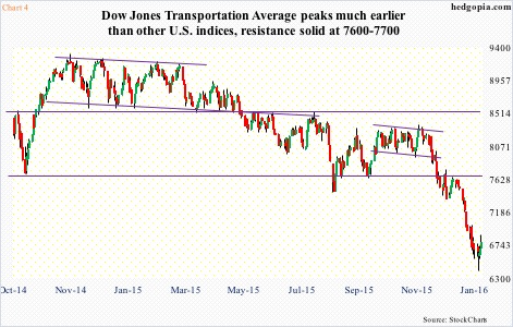 The Dow Jones Transportation Average peaked in November 2014 (Chart 4). Incidentally, crude oil began to come apart after peaking in June 2014. If the collapse in crude was merely supply-related, transports sh/would have rallied as they are heavy users of oil. Rather, they have collapsed as well. From high to low, the index fell just north of 27 percent. The problem is demand-related.