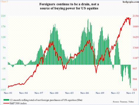 Against this backdrop, foreigners have done a great job of staying out of U.S. stocks. In August through November last year, they sold $66 billion in equities. The last time the 12-month running total was positive was back in October 2013, with November last year minus $107 billion – the highest monthly total ever.