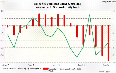 As things stand, the issue is the same as relates to domestic flows. Chart 6 uses flows into U.S.-based equity funds. The green line is the weekly total. The red bars represent the cumulative total beginning September 30th. That date is a good reference point in that on September 29th the S&P 500 successfully tested the August 2015 low before rallying 13 percent in five weeks.