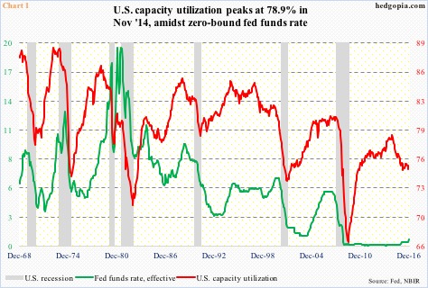 Take capacity utilization, for instance.  It peaked at 78.9 percent in November 2014, peaking before tagging 80 percent (Chart 1).  The Fed funds rate was still near zero, but that was no help.  Utilization was merely 75 percent this November, and has now declined for 21 consecutive months.chart-1