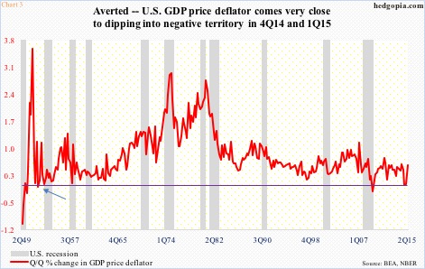 Some other measurements of inflation have been recording weaker readings.  The GDP price deflator rose 0.5 percent in 2Q15, but not before nearly dipping into negative territory, with 4Q14 and 1Q15 barely rising at 0.2 percent and 0.3 percent, respectively (Chart 3).  In fact, when 1Q was first reported, the red line in the chart was reported as a negative 0.1 percent.  This was later revised away, but if it stuck, this would be quite a development.  The last time this series had a negative reading was in the second and third quarters of 2009 – during and shortly after Great Recession ended – and in 1Q52 (arrow in Chart 3).  That is how rare it is.  Yet it is toying with negative territory.