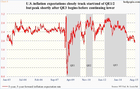 The five-year, five-year forward inflation expectation rate – expected inflation in five years – dipped to 1.87 percent last Thursday – the lowest since August 2010 (Chart 4).  Rather curiously, the red line closely followed the start and end of QE 1 and 2.  But during QE 3, it peaked earlier, and continued lower.  Not sure what the message is – perhaps market participants losing faith in QE’s ability to ignite inflation expectations? Probably.  If so, then we can extend that logic to ZIRP (zero interest-rate policy) as well.