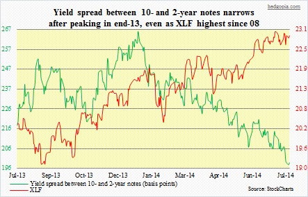 Depending on how mature an economic cycle is, different sectors, and industries within them, act differently. Some lead, some lag, yet others are coincident. Investors gravitate toward sectors such as technology and consumer discretionary when they are more optimistic and are on a risk-on mode. When it is time to pull in horns, sectors to shine include utilities and consumer staples. In this respect, financials carry a lot of weight on investor psyche. Obviously so, as they are the ones that help lubricate the wheels of an economy. Hence it pays to pay heed to how financials are acting at any given point in an economic cycle. Enter the adjacent chart. Since almost the beginning of the year, the spread between 10- and two-year notes has been narrowing. Banks live and die by spreads. A slight exaggeration there, but the fact remains that these entities make their living by borrowing short and lending long. The steeper the curve, the bigger the spread. And this tends to bode well for bank profits, which rather obviously gets reflected into stocks. As can be seen in the chart, for the past three months, the two have diverged. Financial stocks, represented by XLF, have continued to find bids even as the 10-2 spread continues to make new lows.