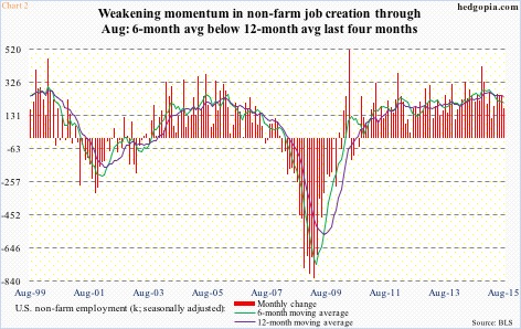 In August, 173,000 non-farm jobs were added – weaker than the eight-month average this year of 212,000.  The average last year was 260,000.  Momentum is weakening.  Chart 2 plots the monthly change in non-farm payroll and its six- and 12-month moving averages.  In the four months through August, the six-month average has crossed below the 12-month.  Once again a sign of decelerating momentum.Chart 2