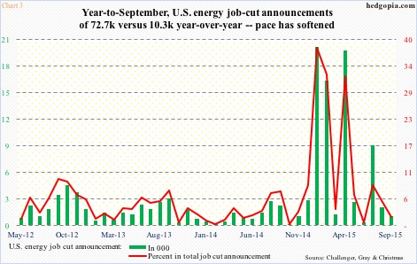 The good thing in all this is that energy probably played a role in the weakening jobs momentum and that the sector is beginning to show some stability.  In the first three quarters this year, job-cut announcements in the sector amounted to 72.7k, versus 10.3k in the comparable period last year.  The 12-month average peaked at 78.5k in July, with September at 76.7k.  September only saw 1.1k job cuts, down from 9.1k in July (Chart 3).Chart 3