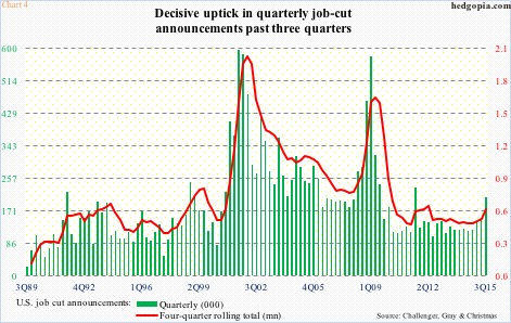 How all this shakes out can have implications for Chart 4.  In it, the green bars represent quarterly job-cut announcements, while the red line is a four-quarter rolling total.  First of all, in a larger scheme of things, they remain low.  But once again, it pays to pay attention to the trend.  Job-cut announcements have risen from 117.4k in 3Q14 to 205.8k in 3Q15, and the four-quarter rolling total from 483.2k in 4Q14 to 613.2k in 3Q15.  The rather sharp rise in the green bars the past three quarters in particular is noticeable.  Granted the 3Q15 total was heavily influenced by July’s 105.7k (versus 41.2k in August and 58.9k in September), the trend nonetheless is up.