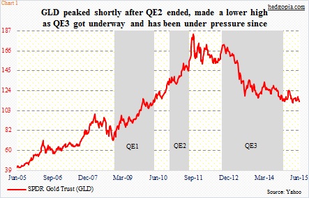 The yellow metal peaked at $1923.70/ounce (GLD at 185.85) shortly after QE2 ended.  Earlier, it bottomed in July 1999 at $253 and was already on a rally mode before the Fed unveiled quantitative easing in November 2008.  Gold rallied vigorously during both QE1 and QE2 (Chart 1), and came under pressure as QE2 ended.  The post-QE2 drop was not a big surprise given the preceding strong rally.  But when it failed to rally as QE3 got underway, that took many by surprise.