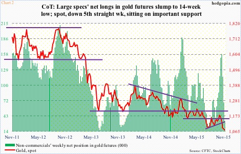 Here is the other side. As stated previously, despite non-commercials reducing their net longs by 78 percent in the past three weeks, gold is hanging in there. Still clinging on to support, but not collapsing. Besides, post-release of October 27-28 FOMC minutes last week, the two-year yield ended the week at 0.93 percent, up from 0.57 percent in the middle of October. Markets are acting as if a hike in December is a given. Gold is not falling apart – still clinging on to support.