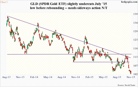 As is seen in Chart 3, GLD, the SPDR Gold ETF, has been pushed down by a downtrend line for over two years now, resulting in loss of support at first $114 and then $110. Most recently, the July (this year) low was briefly undercut as well.