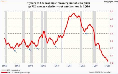 In the meantime, money velocity has collapsed. Unlike in the past when midway through the recovery M2 money velocity begins to turn up (arrows in Chart 2), this cycle has been like no other. Unless we optimistically – and irrationally – assume that the recovery is not even halfway through, the suppressed velocity is an enigma. At 1.458, it just made a new low in 1Q16. When the recovery started, velocity was 1.712.
