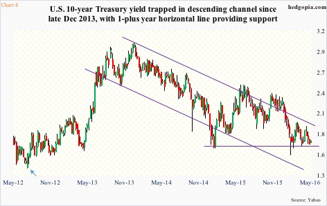 In fact, the 10-year has been trading within a descending channel since late December 2013. Within that downtrend, since early last year, it has found a floor in the 1.65-1.7 percent range. Barring a drop in July 2012 to 1.39 percent (arrow in Chart 4), this support goes back to September 2011.