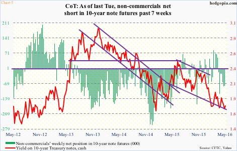 Non-commercial traders in 10-year note futures are positioned to benefit if that floor holds and the 10-year heads higher. Since late March this year – in the past seven weeks through Tuesday last week – they have been net short (Chart 5).
