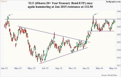 If instead the 10-year breaks this floor and the non-commercials get squeezed, we are looking at a potential breakout on TLT, the iShares 20+ year Treasury bond ETF.