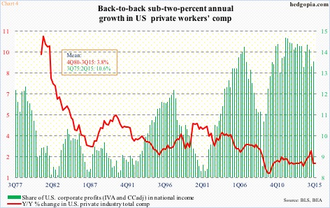 Economists were waiting with abated breath the employment cost index for the third quarter. Earlier in 1Q15, private-sector compensation increased at 2.8 percent annually. This was better than the slightly above two percent pace that average hourly earnings have been growing on a monthly basis. Optimists were hoping the 1Q15 reading was a harbinger of things to come. Apparently not. Total comp (both wages and salaries, and benefits) decelerated to 1.9-percent growth in the second quarter, with the third quarter unchanged – for back-to-back sub-two-percent growth (Chart 4).