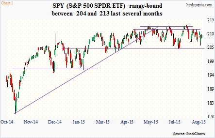 SPY, the SPDR S&P 500 ETF, has had its share of wild swings.  It is still range-bound – trapped between 204 and 213 (Chart 1).  Where then might it be headed next?  Better yet, might options be a better way to play the ETF in the near-term?  Let us dive in and find out.chrt 1