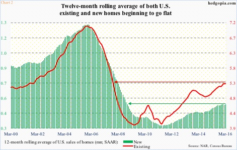 Chart 2 uses a 12-month moving average of both existing and new home sales. In new homes, in three out of the last four months to March, sales came in at 503,000. In existing homes, January was 5.28 million, followed by 5.29 million in both February and March. Sales are flat-lining.