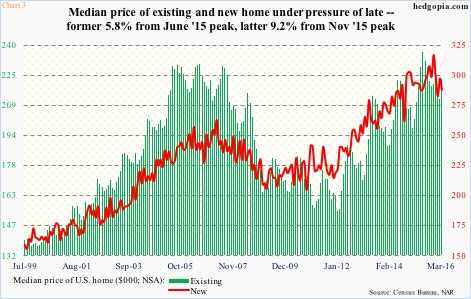 More importantly, most recent sales deceleration can be detected by using a shorter-term average. Using a three-month average, sales of existing homes peaked at 5.4 million last September, with March at 5.29 million, while new home sales peaked at 526,000 this February, with March at 517,000 (not shown here).