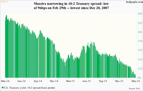 Small-caps inherently have more domestic exposure, and tend to do well if the economy does well. The bond market nonetheless continues to forecast subdued economic activity. The yield spread between 10- and two-year Treasury notes dropped to 96 basis points in the last two sessions of February before rising a tad. The late-February low marked the narrowest spread since December 20, 2007 (Chart 2).