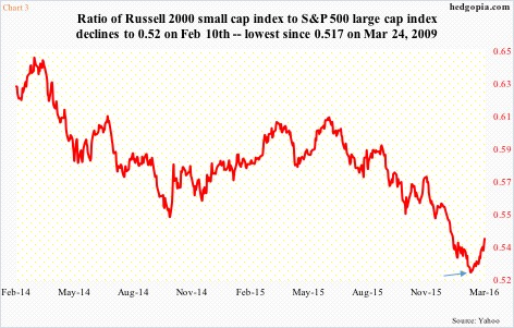 Such was the underperformance versus larger peers that the ratio of the Russell 2000 to the S&P 500 started dropping in late June last year and would only bottom last month. The February 10th low of 0.52 (arrow in Chart 3) was the lowest since 0.517 on March 24, 2009. Side note: this could potentially end up being an important low in the ratio. Time will tell.