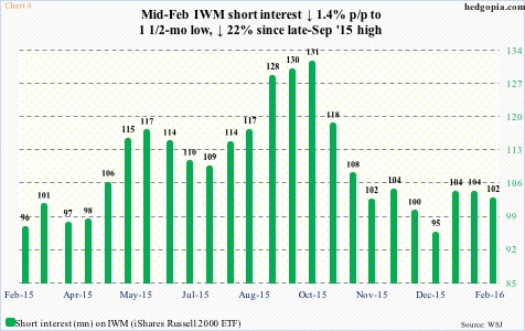 Besides, short interest on IWM is not as high as in late September (Chart 4) – when shorts massively got squeezed – but probably high enough to lend a helping hand to the ETF’s rally. The mini-breakout took place on March 1st (Chart 1), so the end-February period would not reflect this. But IWM already rallied nearly eight percent in the February 12-29 reporting period, probably resulting in some level of squeeze.