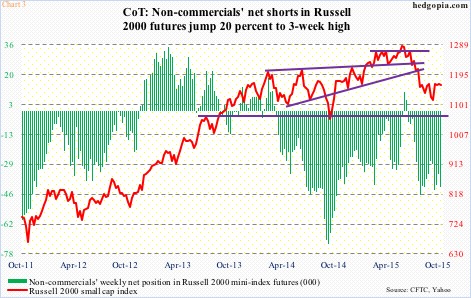 In this regard, non-commercials’ dogged bearish sentiment toward small-caps was telling. To be fair, they have been wrong directionally the past couple of months, but at the same time have shown enough conviction not to yield. As of September 29th, net shorts in Russell 2000 mini-index futures were 28,955 contracts, and rose to 41,447 as of last Tuesday (Chart 3). In contrast, net shorts in e-mini S&P 500 futures declined from 227,575 to 166,039 during the period. In the latest period, net shorts in Russell 2000 futures went up 20 percent, even as they declined 36 percent in the S&P 500.