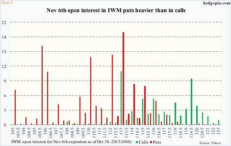 Once again, it is hard to imagine a scenario in which this resistance gets taken out – at least this week. Under this assumption, calls can be hypothetically written to either go short near that level or generate premium. November 6th 116.50 calls are selling for $0.57. If called away, it is an effective short at $117.07. Else, the premium is kept.