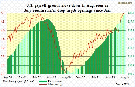 JOLTS job openings vs. employmentRemember the August payroll report, which came in much weaker than the consensus was expecting?  After six consecutive months of 200k-plus (April in fact was 300k-plus) jobs, August produced a mere 142k.  Across the board, economists quickly brushed it off saying it was just one-off.  After all, as have been discussed on this blog, job openings have been very healthy.  From this perspective, the August report did look like an aberration.  Until Tuesday, when the Bureau of Labor Statistics published the JOLTS survey for July.  Job openings nudged lower month-over-month.  This was the first time since January that the series saw m/m deceleration.  A couple of points.  First of all, the survey only goes back 2004, so there is not much historical data to base one’s judgment on.  Secondly, as can be seen in the accompanying chart, in March 2007 and July 2009, ‘job openings’ did indeed lead payroll.  One month does not make a trend, but after the sharp spike beginning January on the right side of the chart the red line seems to want to go flat.  Now, this does not mean payroll is going to weaken right away.  Once again, if the job-openings data that were reported in prior months are any indication, payroll should continue to post decent numbers in the next several months.  What happens after that depends on how ‘job openings’ come in now.  July was a disappointment, to say the least.  Hopefully an aberration.  If not, watch out for payroll weakness in outer months.