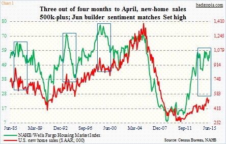 If instead of focusing on volatile monthly data, we run a 12-month average of housing starts as well as sales of new and existing homes, all three are close to or at cycle highs (one million units, 517,000 units, and five million units in April, respectively). Granted activity is subdued, but the trend is up. Is that the reason why builder sentiment is hanging in there?