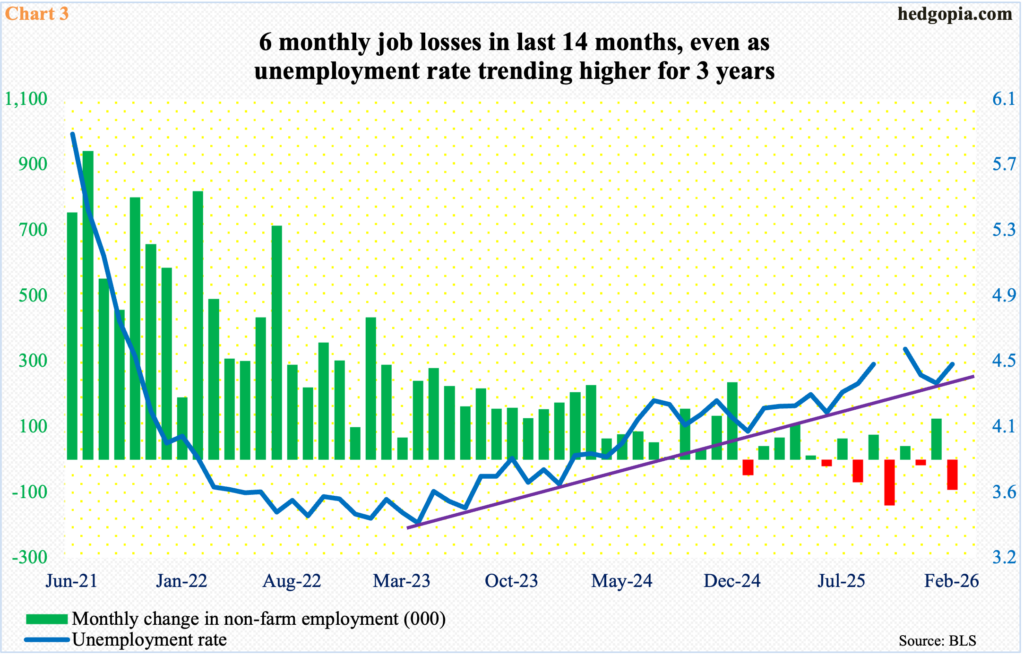 February cannot be brushed off as a one-off. Over the last 14 months, there have been six negative months (Chart 3). Concurrently, the unemployment rate has trended higher. The monthly low of 3.45 percent in April 2023 was the lowest in 54 years; unemployment since has gradually trended higher, with February coming in at 4.44 percent, up from January’s 4.32 percent. One would think the latest weakness in job creation would force the Fed’s hands into adopting a looser monetary policy, but the Middle East conflict has thrown a monkey wrench into this.