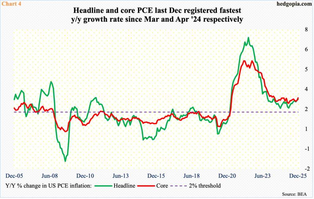Already, headline and core PCE (personal consumption expenditures) has been on a gradual uptrend for the last several months (Chart 4). In the 12 months to December, they respectively registered growth rates of 2.9 percent and three percent. This was the fastest monthly pace since March and April of 2024, having bottomed last April at 2.3 percent and 2.6 percent, in that order. (January’s reading will be published on Friday.)