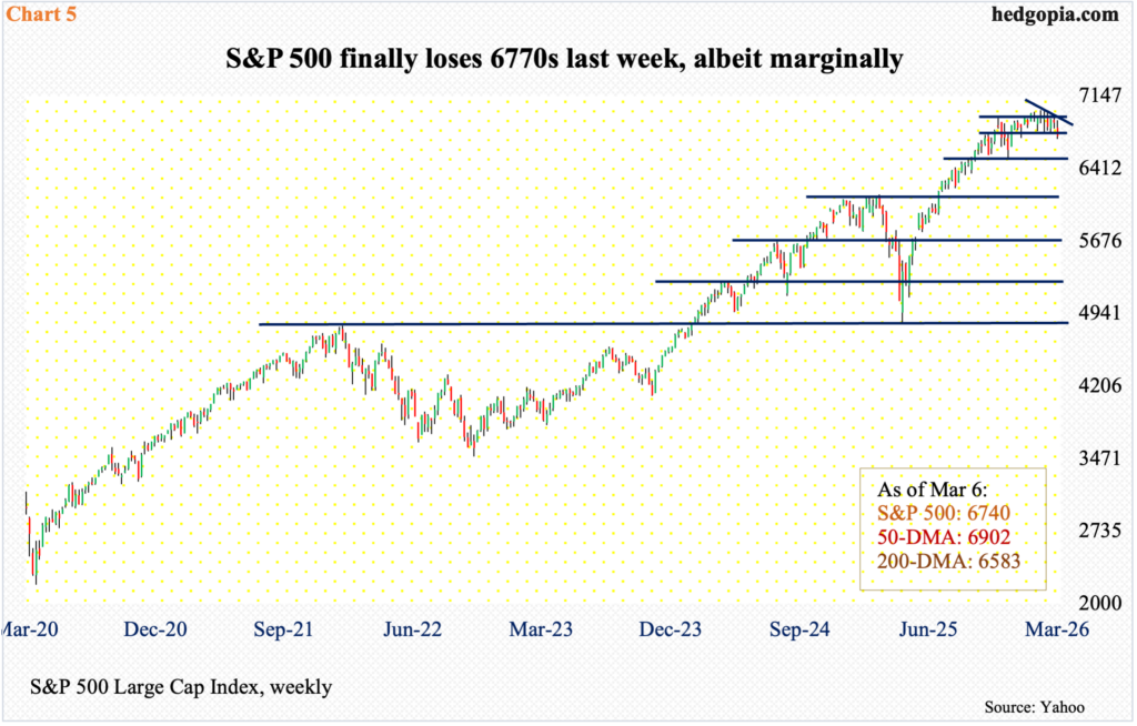 What is transpiring in the oil market is also reverberating through the stock market. Last week, the S&P 500 dropped a couple of percent to 6740, losing the potentially important 6770s (Chart 5).