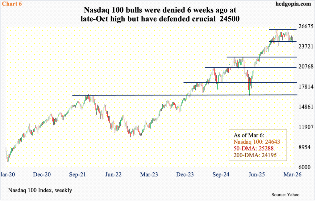 As a matter of fact, after a massive rally post-April ’25 bottom, the S&P 500 went sideways for 18 weeks before losing 6770s last week. This comes on the heels of four weekly spinning tops in seven weeks. On the monthly, February, January and December all produced a spinning top, preceded by November’s hanging man.