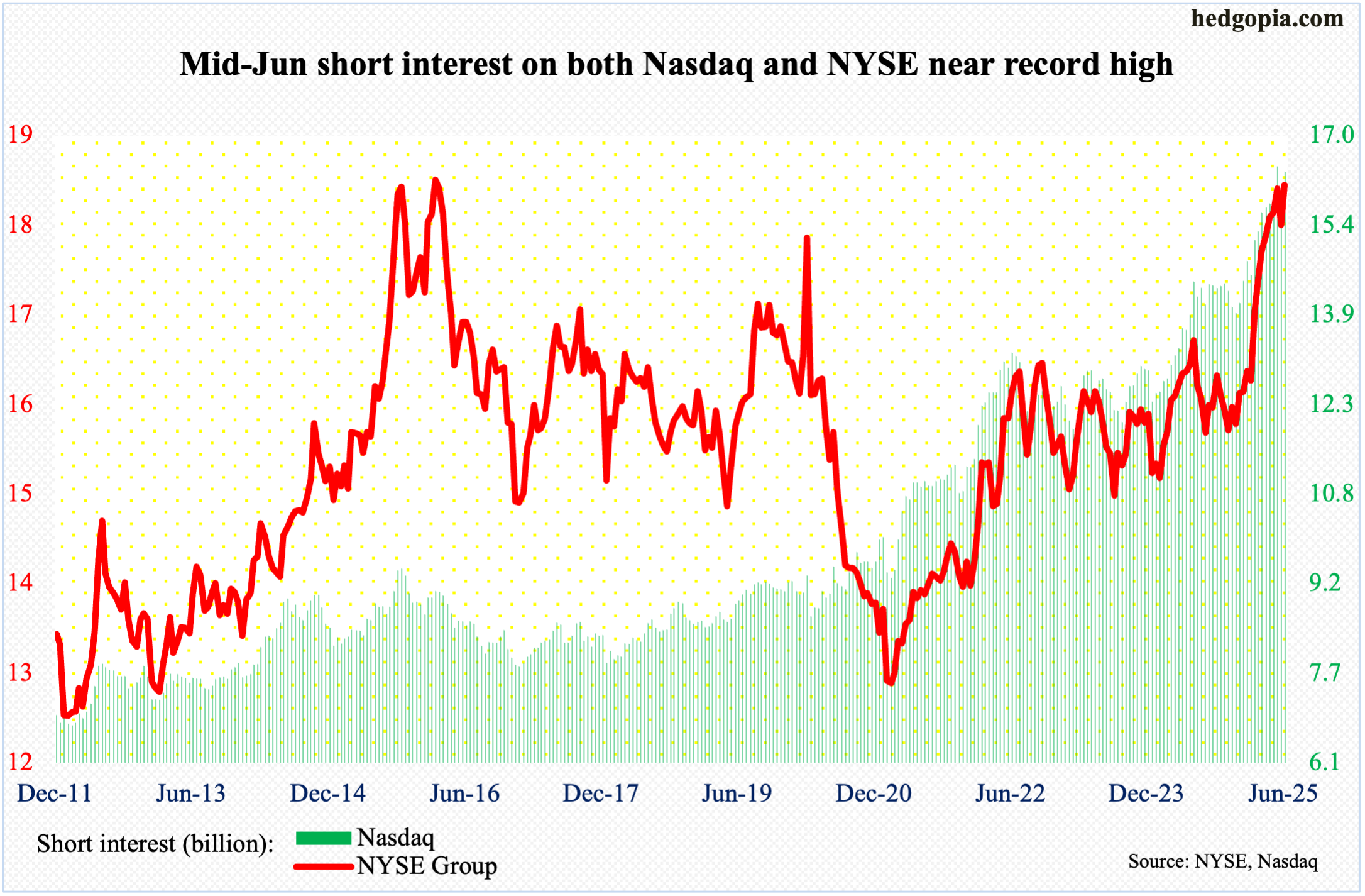 As of end-November last year, Nasdaq short interest stood at 13.9 billion; mid-June this year, this was 16.4 billion, within striking distance of the mid-May (2025) record of 16.5 billion. On the NYSE, short interest was 15.7 billion at the end of last October; by the middle of this month, this had grown to 18.5 billion, which just about matches the mid-February 2016 high and is a little below the end-July 2008 record of 18.6 billion.