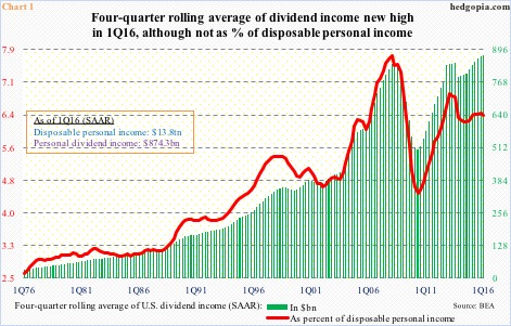 Dividend income is an important source of income. In 1Q16, it increased 1.3 percent year-over-year to a seasonally adjusted annual rate of $874.3 billion, down from $876.9 billion in the prior quarter. Dividends made up 5.6 percent of U.S. personal income – not massive, but decent. Personal income was $15.7 trillion during the quarter.