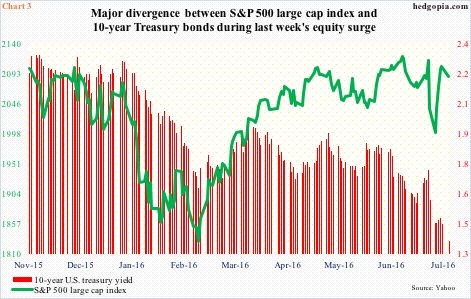 Perhaps the most vivid example of ‘was it risk-on or risk-off’ confusion could be seen when stocks were pitted against bonds. Not surprisingly, between June 23rd and 27th, 10-year yields dropped from 1.74 percent to 1.46 percent. The S&P 500 was pounded for a 5.3-percent decline in those two sessions, then rising 5.1 percent in the next four. The 10-year yield, however, went flat during those four sessions. This was a massive divergence, and shows traders were running for safety. The bond market was not buying the optimism shown by the stock market. (Yesterday, yields dropped to an all-time low of 1.36 percent before closing the session at 1.37 percent, surpassing the prior record of 1.39 percent in July 2012.)