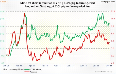 Here is a brief review of change in short interest in the October 1-14 period in the Nasdaq and NYSE Group as well as nine S&P 500 sectors.chart-1
