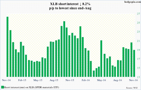 On November 3, XLB found support at the lower Bollinger band, and never looked back, further bolstered by the Trump rally; resistance at $49-plus stopped the advance during the period. This probably led shorts to not give up completely. Short interest was down but not huge.