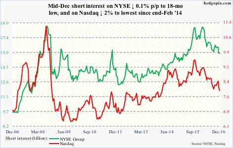 In the November 16-30 period, short interest fell 3.9 percent p/p. In the December 1-15 period, this dropped another two percent – to the lowest since February 2014.