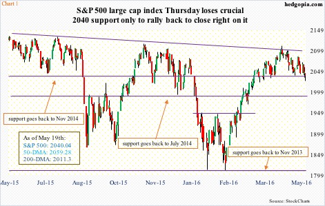 The Russell 2000 small cap index is at a similar crucial juncture. It peaked in June last year, and most recently on April 27th (lower highs). Since the recent high through the intra-day low yesterday, it dropped 6.1 percent, losing both 50- and 200-day moving averages in the process. In the five sessions through Wednesday, these averages persistently denied rally attempts.